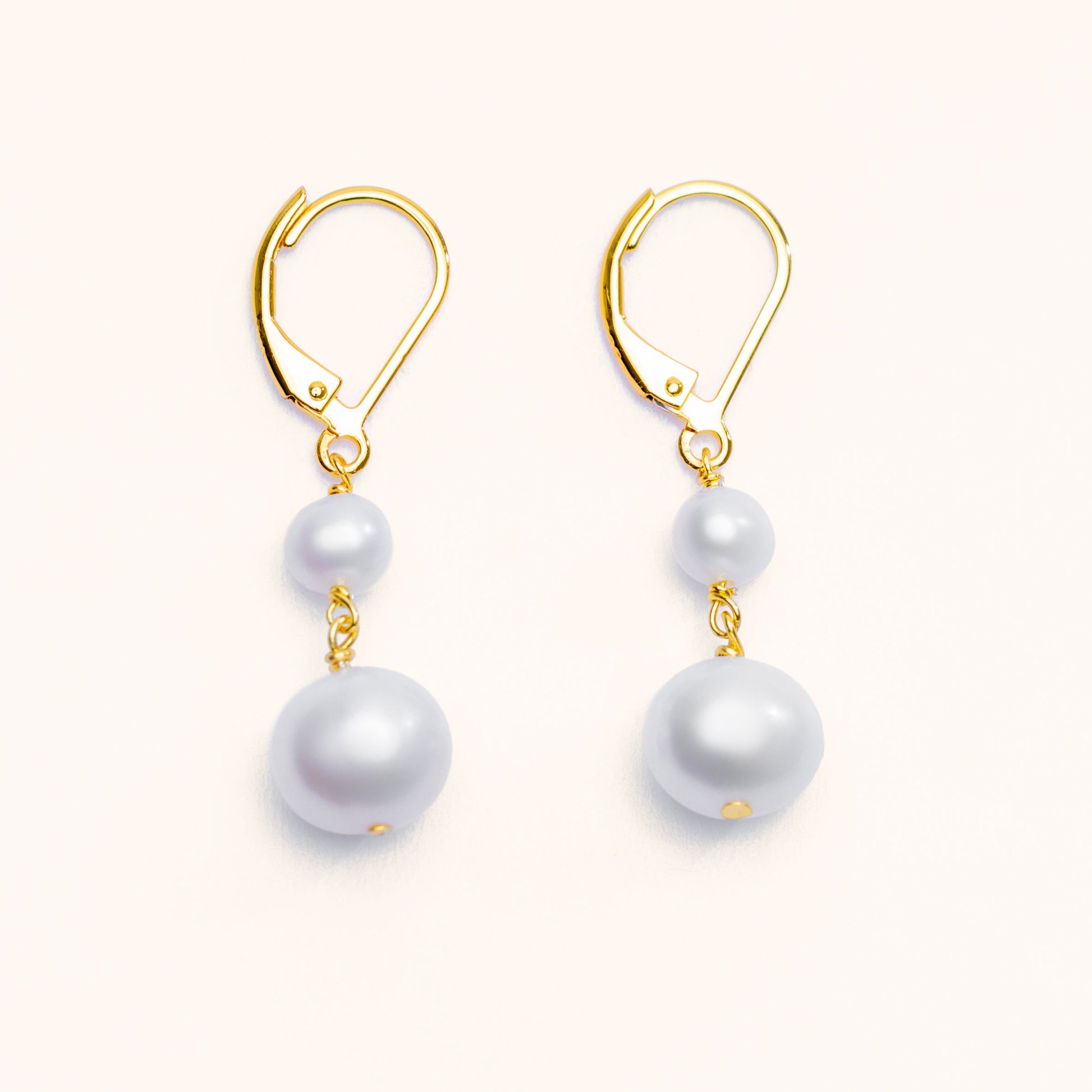 The Dual Pearl Earrings feature a timeless design with a smaller freshwater pearl elegantly suspended above a larger, luminous pearl. Paired with a sleek gold setting, this sophisticated piece adds a touch of refined elegance to any occasion.