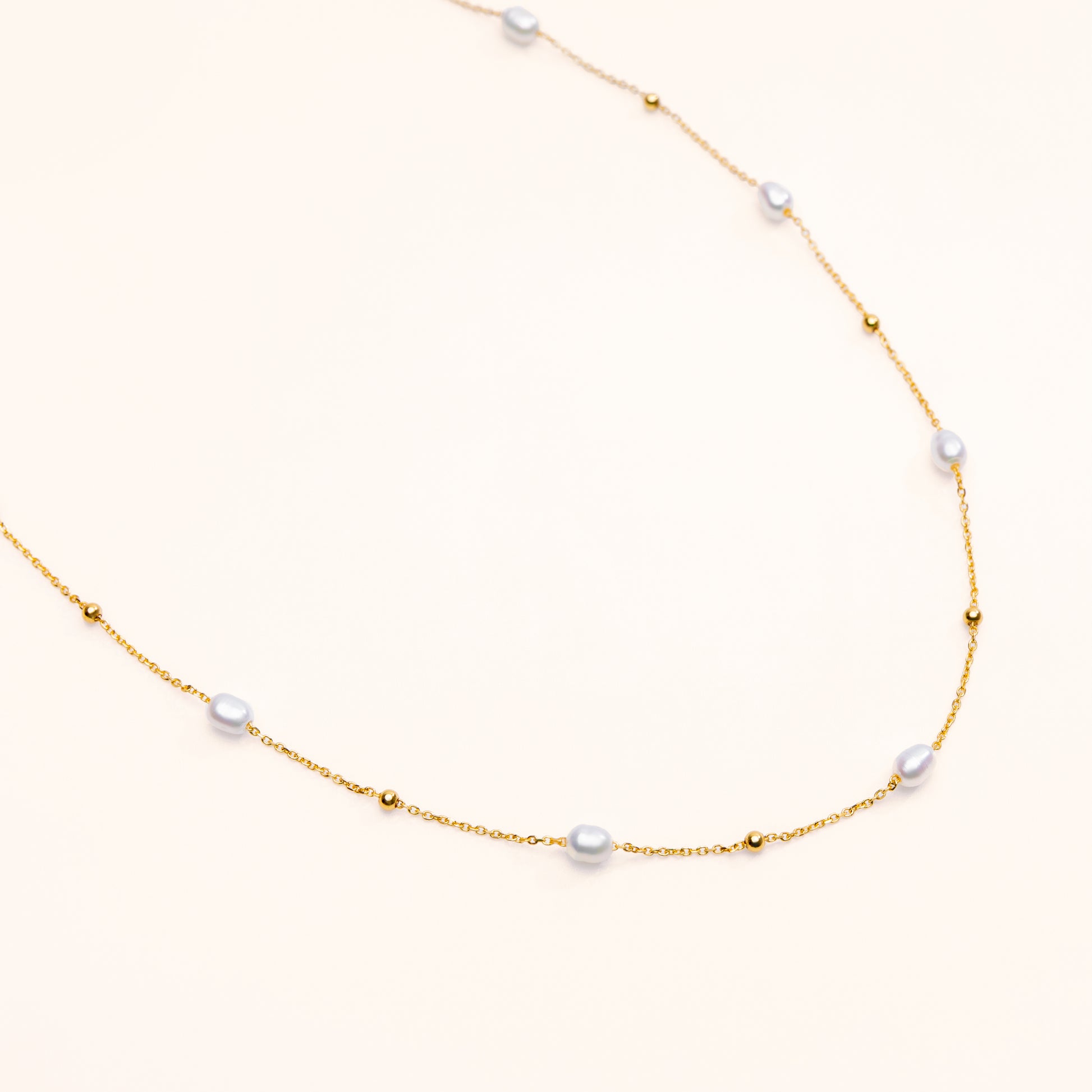 The Pearl Bead Chain is a delicate design featuring a fine gold chain adorned with alternating rice-shaped freshwater pearls and gold beads. Perfect for layering or wearing on its own, this piece adds a touch of effortless elegance to any outfit.