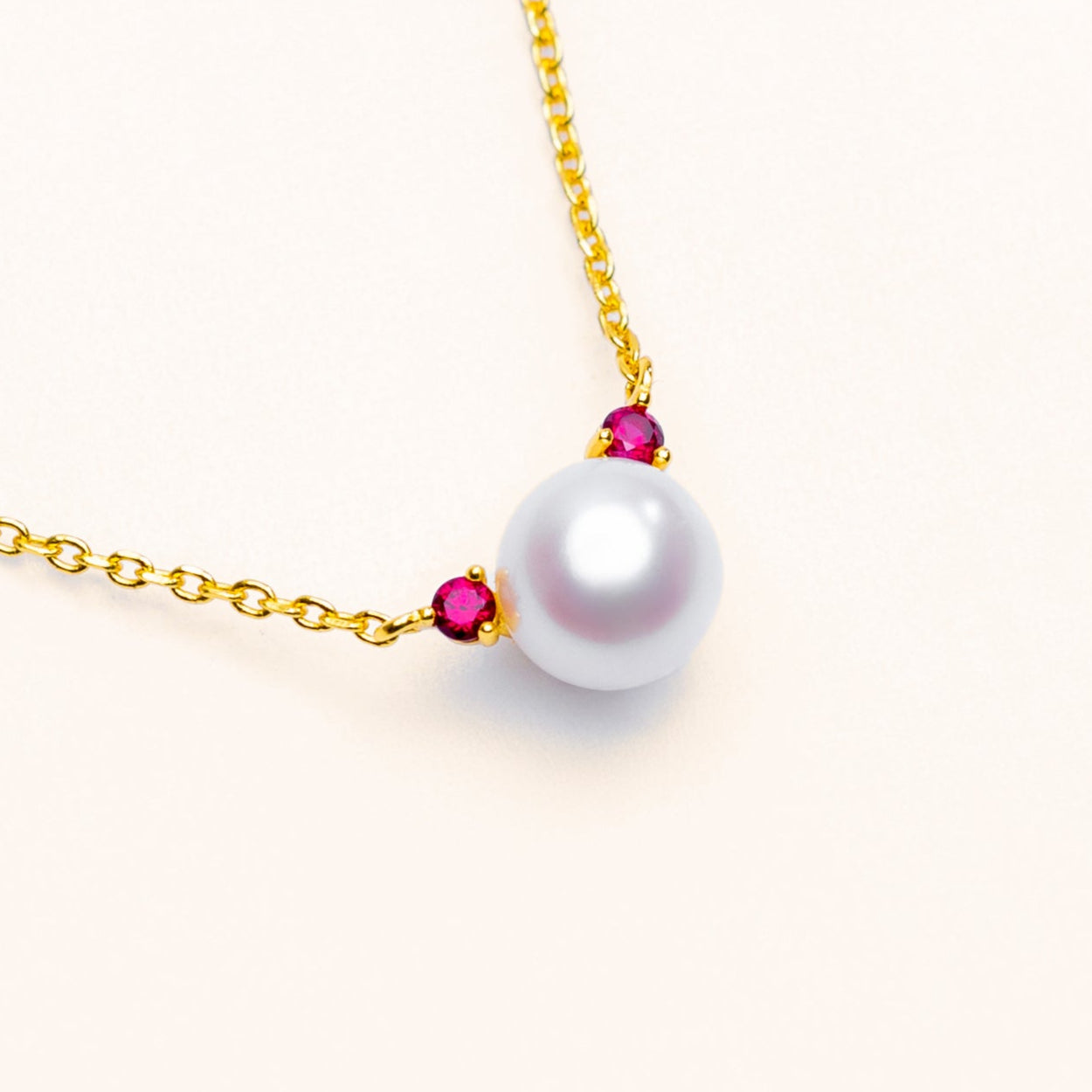 The Accent Glow Necklace features a single luminous round pearl, accented by vibrant rubies on a dainty gold chain. This minimalist design with a pop of color adds a subtle yet striking touch, perfect for everyday elegance or layered looks. Wear it normally or as a choker by sliding the adjustable clasp.