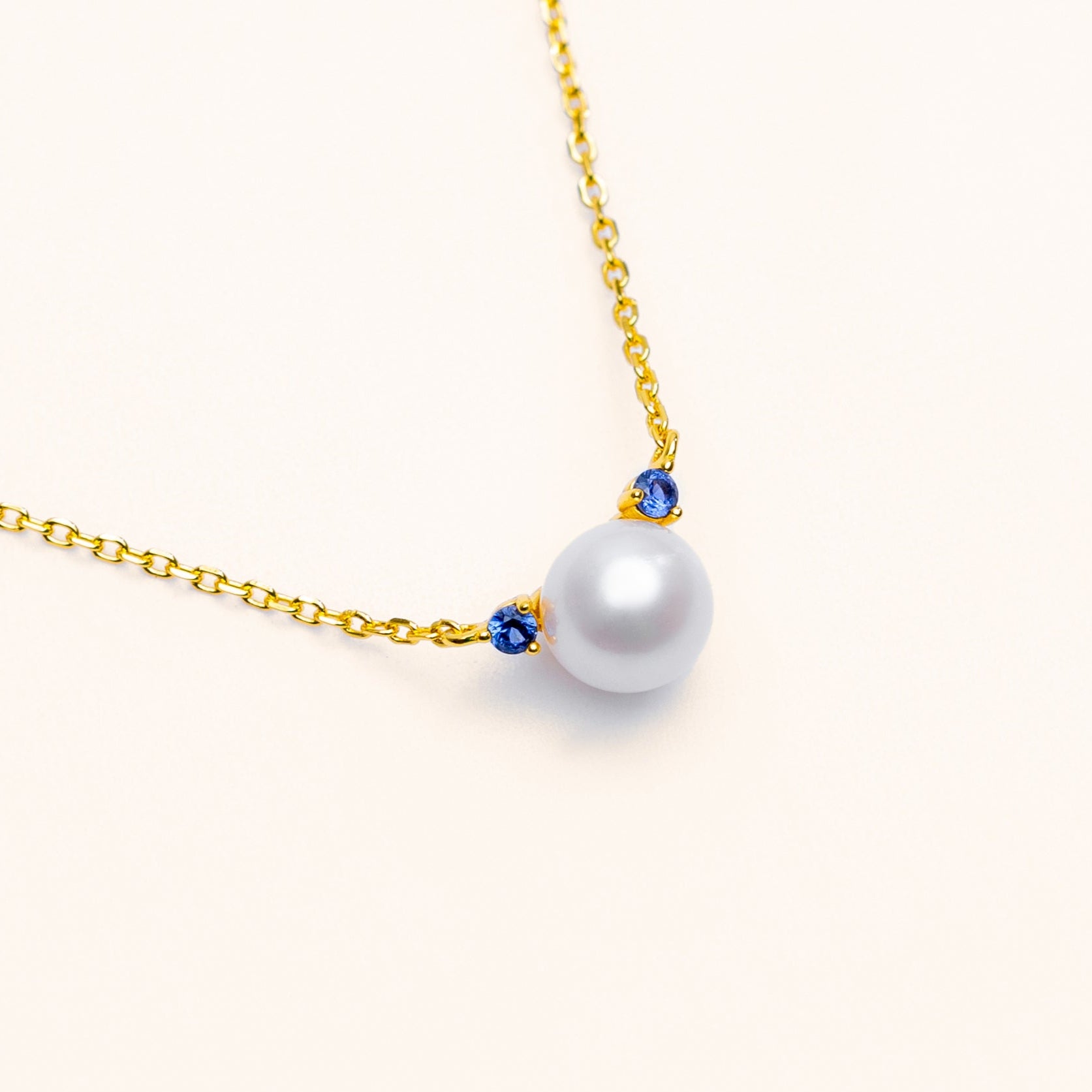 The Accent Glow Necklace features a single luminous round pearl, accented by vibrant sapphires on a dainty gold chain. This minimalist design with a pop of color adds a subtle yet striking touch, perfect for everyday elegance or layered looks. Wear it normally or as a choker by sliding the adjustable clasp.