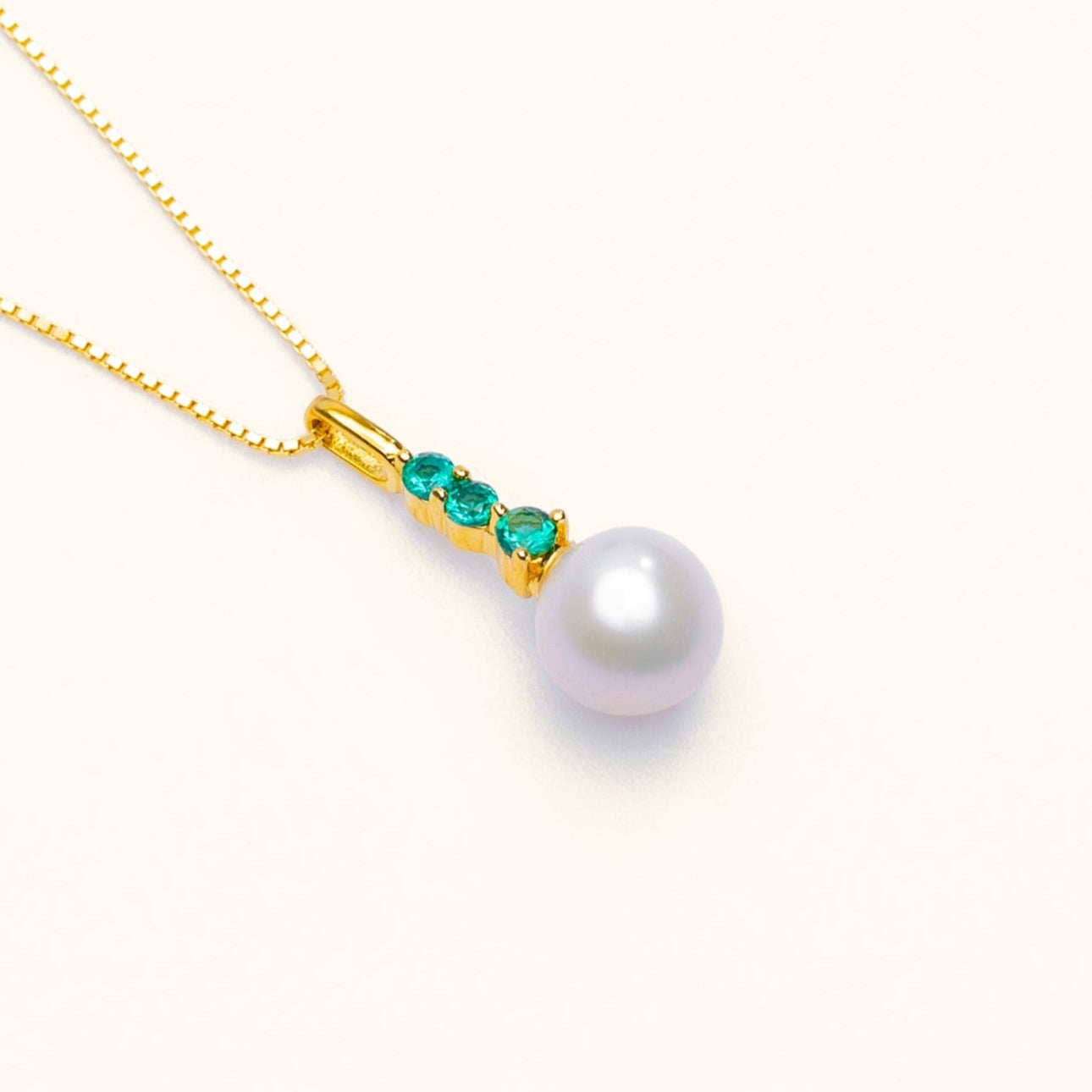 The Aurora Pearl Pendant combines understated luxury with timeless charm. Featuring a luminous round pearl accentuated by three bright emeralds, this piece is designed to add subtle elegance to any look. Wear it normally or as a choker by sliding the adjustable clasp.