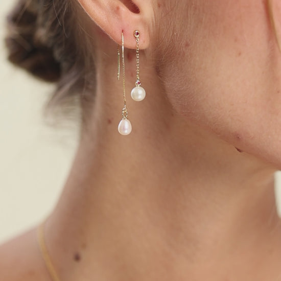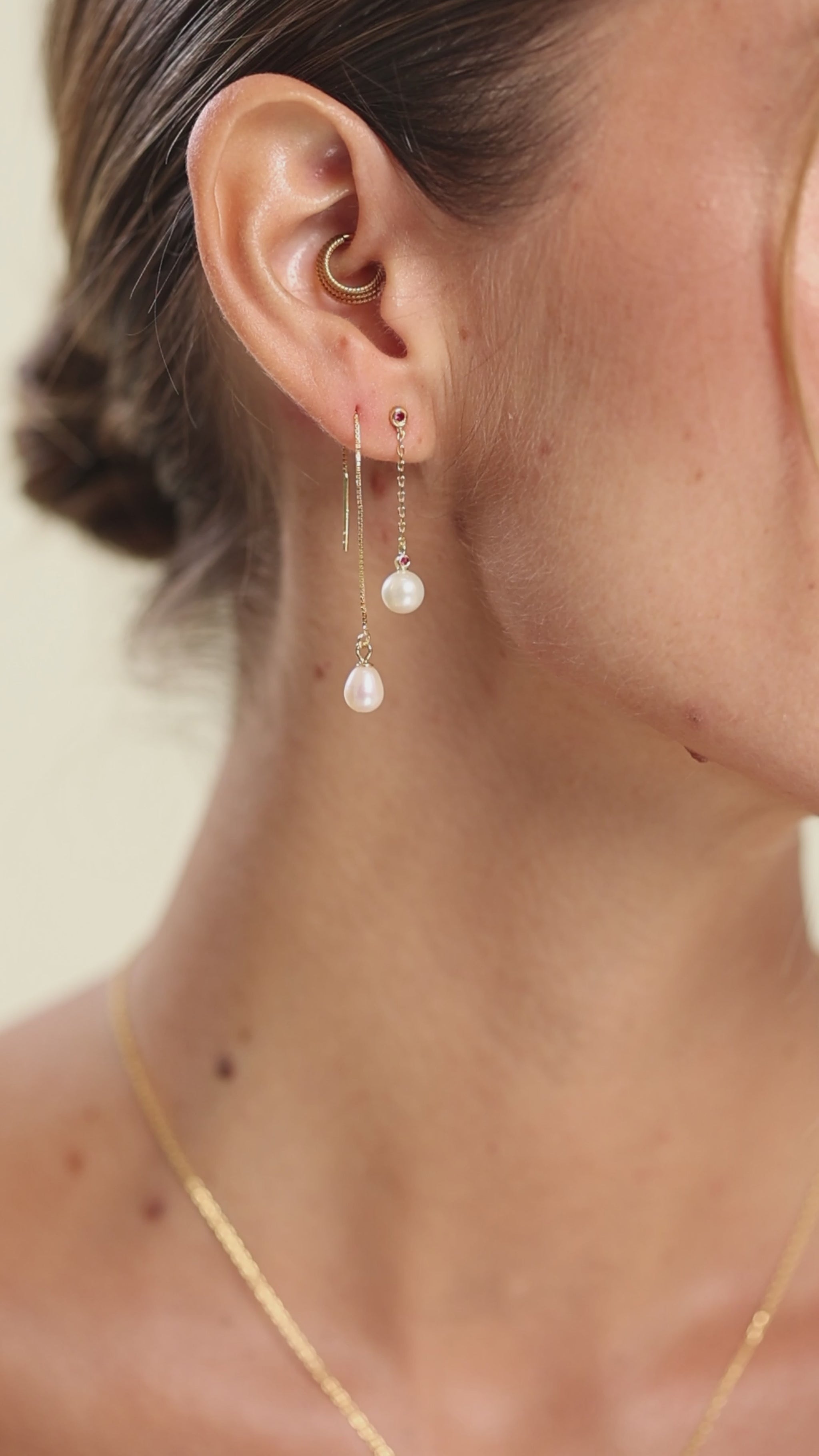The Golden Drip Earrings feature delicate gold chains with luminous freshwater pearls hanging elegantly at the ends. Designed with adjustable chains, these earrings can be worn at any length, adding a refined drip of sophistication to your look, perfect for both casual and formal occasions.