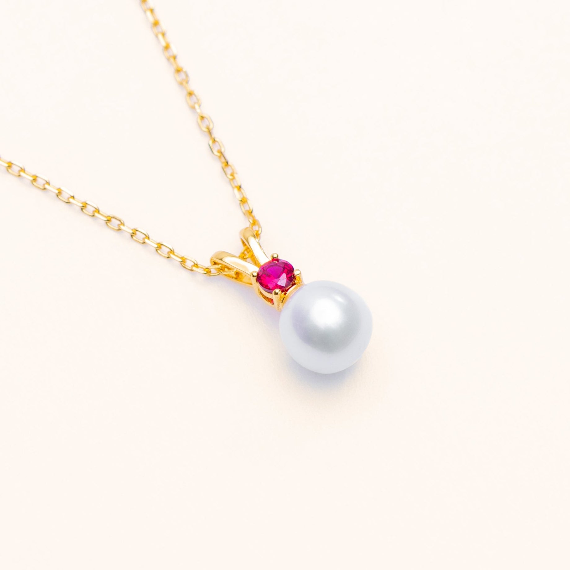 The Halo Pearl Pendant is a timeless design featuring a luminous round freshwater pearl topped with a bright ruby. Paired with an adjustable gold chain, this piece adds effortless elegance to any outfit. Wear it normally or as a choker by sliding the adjustable Luna clasp.