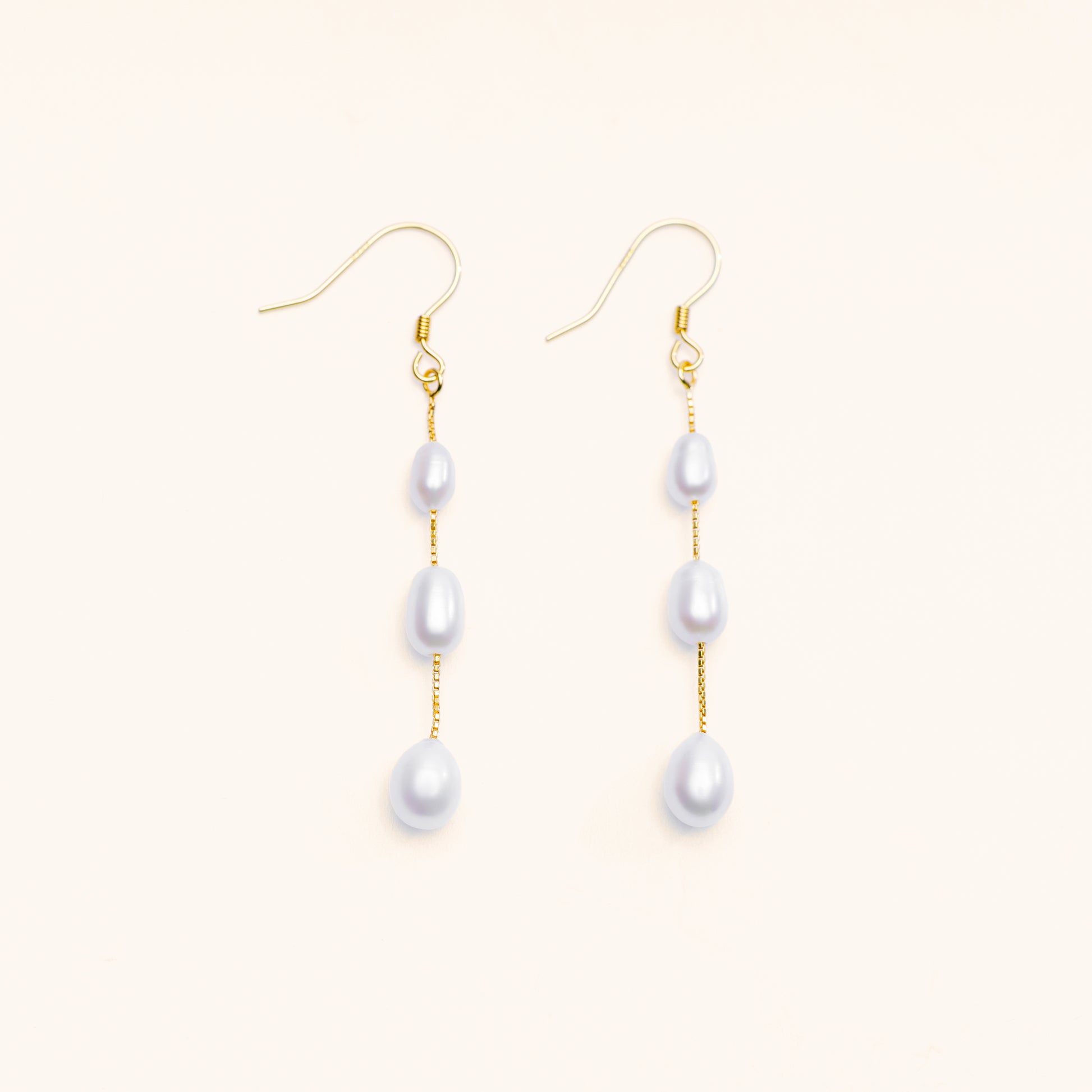The Pearl Stream Earrings feature a cascading design with three luminous freshwater pearls, arranged from smallest to largest, elegantly hanging from a delicate gold chain. These earrings create a graceful drip effect, perfect for adding sophistication to any outfit.