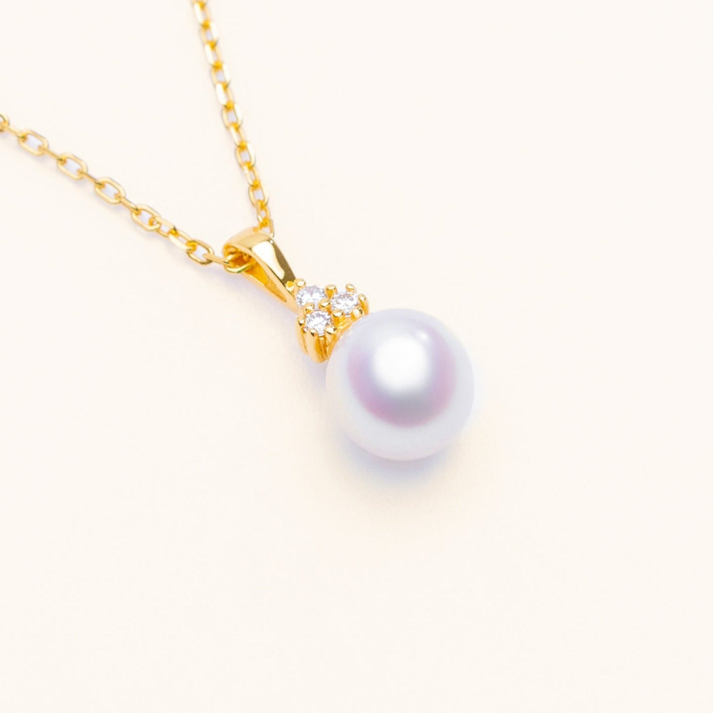 The Trinity Pearl Pendant features a luminous round freshwater pearl complemented by three sparkling diamonds. Wear it normally or as a choker by sliding the adjustable clasp.
