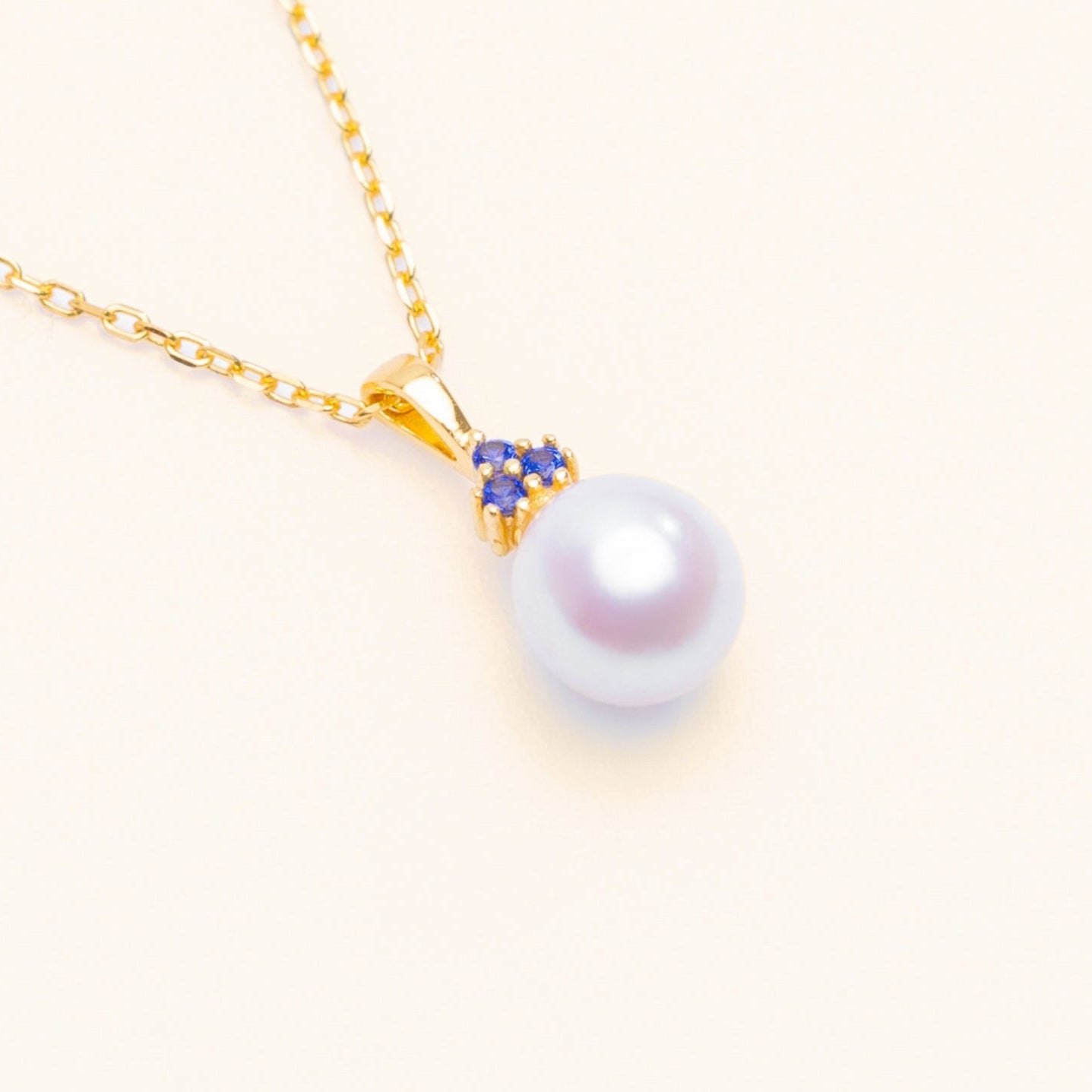 The Trinity Pearl Pendant features a luminous round freshwater pearl complemented by three sparkling sapphires. Wear it normally or as a choker by sliding the adjustable clasp.